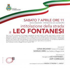 Sabato 7 aprile, – alle ore 11, nella zona industriale di Correggio, intersezione con via Gandhi – è in programma la cerimonia di intitolazione di una nuova strada a Leo Fontanesi, partigiano e imprenditore, alla presenza del sindaco di Correggio, Ilenia Malavasi, del vice prefetto di Reggio Emilia, Giorgio Orrù, dei famigliari di Leo Fontanesi e di Anpi Correggio.