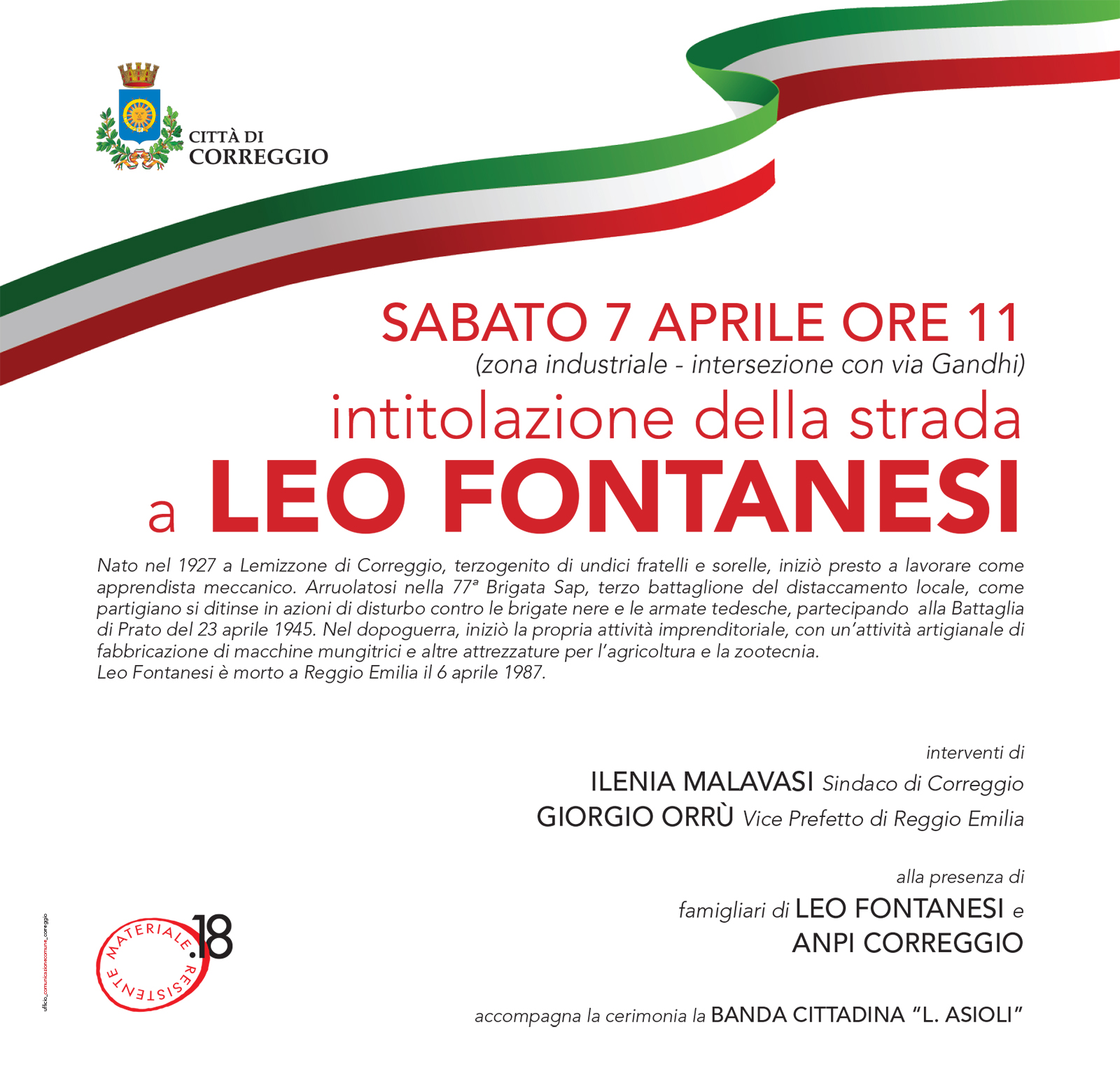 “Dopo il collaudo e la cessione al Comune di questa nuova infrastruttura, gli stessi attuatori ci hanno proposto di valutare l’intitolazione della nuova strada alla memoria dell’imprenditore e partigiano Leo Fontanesi, idea che abbiamo accolto con favore”, commenta Ilenia Malavasi, sindaco di Correggio. “La figura umana e imprenditoriale di Fontanesi, infatti, è testimone di tante altre vicende simili, di uomini e donne di una generazione che prima ha contribuito a liberare il nostro Paese dal nazifascismo e poi, grazie all’ingegno e alla creatività tipica di questa terra, ha dato vita a imprese e aziende che hanno costituito il tessuto economico fondamentale del nostro territorio e il motore principale del sistema imprenditoriale italiano. Con questa intitolazione, inoltre, diamo il via al nostro “Aprile di primavera e libertà”, il calendario di iniziative che caratterizzeranno tutto il mese di aprile a Correggio sui temi della libertà, della legalità, della democrazia, dei diritti e dell’inclusione e che avrà il proprio centro, naturalmente, con la Festa della Liberazione, mercoledì 25 aprile, e il tradizionale e atteso appuntamento con materialeResistente”.