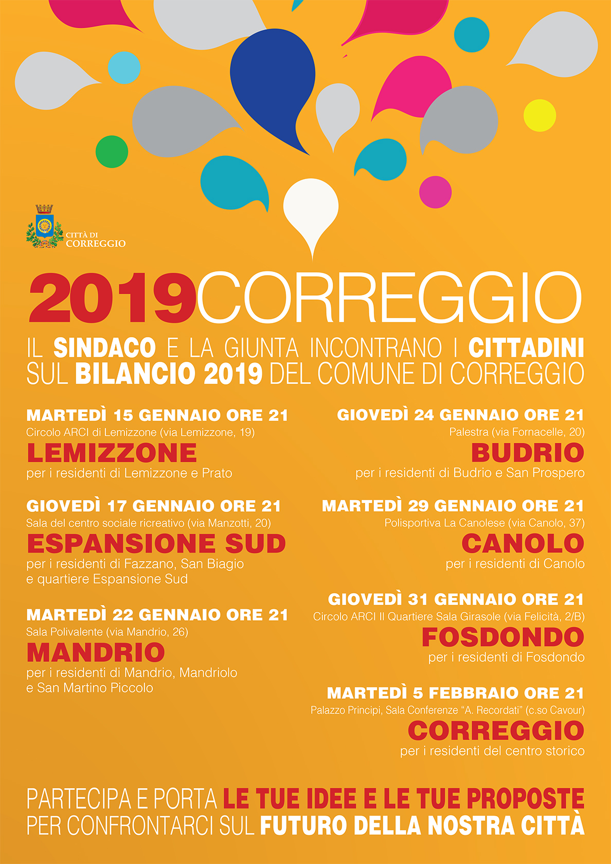 Prende il via, martedì 15 gennaio, la serie di incontri con la cittadinanza durante i quali l’amministrazione comunale di Correggio presenta il bilancio di previsione 2019. Primo appuntamento a Lemizzone, nella Sala ARCI (via Lemizzone 19), alle ore 21, per i cittadini residenti a Lemizzone e Prato. Il calendario degli appuntamenti sarà poi il seguente (sempre alle ore 21): giovedì 17 gennaio al centro sociale dell’Espansione Sud (via Manzotti 20), per i cittadini di Fazzano, San Biagio e del quartiere Espansione Sud; martedì 22 gennaio nella Sala Polivalente di Mandrio (via Mandrio) per i residenti di Mandrio, Mandriolo e San Martino Piccolo; giovedì 24 gennaio alla palestra di Budrio, per i residenti di Budrio e San Prospero; martedì 29 gennaio a Canolo, alla Polisportiva La Canolese (via Canolo 37); giovedì 31 gennaio al Circolo Il Quartiere di Fosdondo; martedì 5 febbraio, infine, nella sala conferenze “A. Recordati” di Palazzo dei Principi, per i cittadini del centro storico.