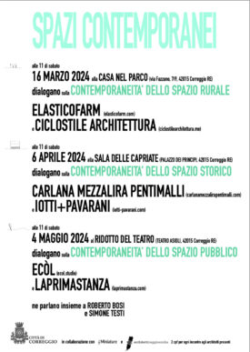 Terzo appuntamento alle 11 di sabato 4 MAGGIO 2024 al RIDOTTO DEL TEATRO (TEATRO ASIOLI, 42015 Correggio RE) dialogano sulla CONTEMPORANEITA’ DELLO SPAZIO PUBBLICO ECÒL (ecol.studio) e LAPRIMASTANZA (laprimastanza.com) ne parlano insieme a ROBERTO BOSI e SIMONE TESTI