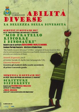 Abilità diverse” è il titolo del programma di incontri promossi dal Comune di Correggio sul tema della disabilità. Primo appuntamento giovedì 19 gennaio, alle ore 21, nella sala conferenze “A. Recordati” di Palazzo dei Principi, con Giacomo Mazzariol, intervistato dal direttore di Radio Bruno, Pierluigi Senatore.