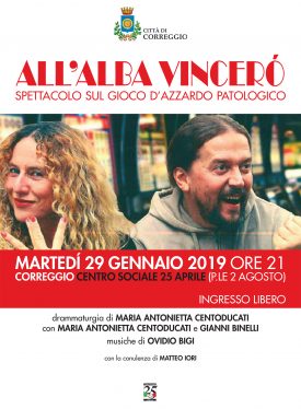 Si intitola “All’alba vincerò”, lo spettacolo sul gioco d’azzardo patologico, promosso dal Comune di Correggio e che va in scena martedì 29 gennaio, alle ore 21, sul palco del Centro Sociale 25 Aprile (ingresso libero).