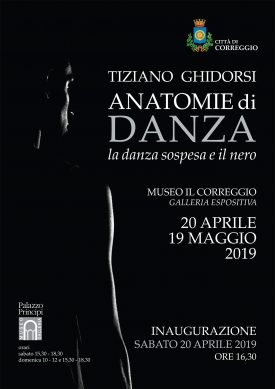 Inaugura sabato 20 aprile, alle ore 16,30, “Anatomie di danza – La danza sospesa e il nero”, personale fotografica di Tiziano Ghidorsi, allestita nella Galleria Espositiva del Museo Il Correggio, a Palazzo dei Principi.