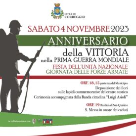 Il Comune di Correggio, in collaborazione con le associazioni ANMIG, ANCR e ANPI, celebra, sabato 4 novembre, la Festa dell’Unità Nazionale e la Giornata delle Forze Armate.
