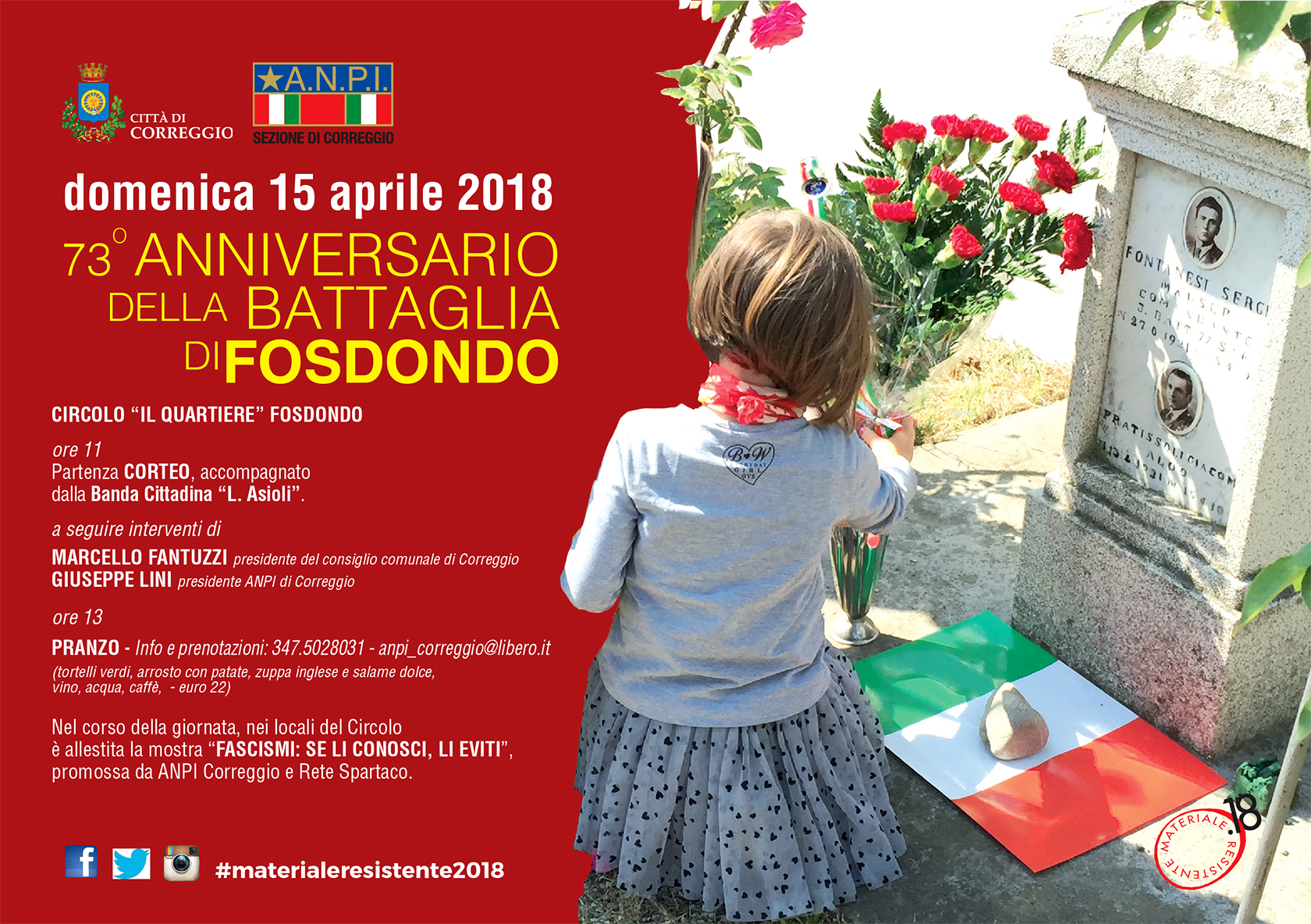 Il programma delle celebrazioni – inserito nel calendario di “Un aprile di primavera e libertà”, un mese di iniziative che porteranno all’appuntamento del 25 aprile con #materialeresistente2018 – prevede, alle  ore 11, il ritrovo al Centro Sociale “Il Quartiere” di Fosdondo, in via Felicità, e la sfilata commemorativa con deposizione dei fiori sui cippi dei caduti accompagnata dalla banda cittadina “Luigi Asioli”; a seguire interventi di Marcello Fantuzzi, presidente del consiglio comunale di Correggio, e di Giuseppe Lini, presidente ANPI Correggio.
