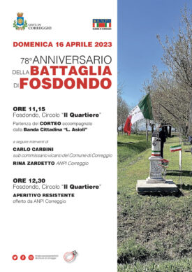 Il programma delle celebrazioni, inserito nel calendario di “Un aprile di primavera e libertà”, un mese di iniziative che porteranno all’appuntamento di martedì 25 aprile con #materialeresistente2023, vede, alle ore 11,15, il ritrovo al Centro Sociale “Il Quartiere” di Fosdondo, in via Felicità, e la sfilata commemorativa con deposizione dei fiori sui cippi dei caduti accompagnata dalla banda cittadina “Luigi Asioli”; a seguire interventi di Carlo Carbini, sub commissario vicario del Comune di Correggio, e di Rina Zardetto, per ANPI Correggio.