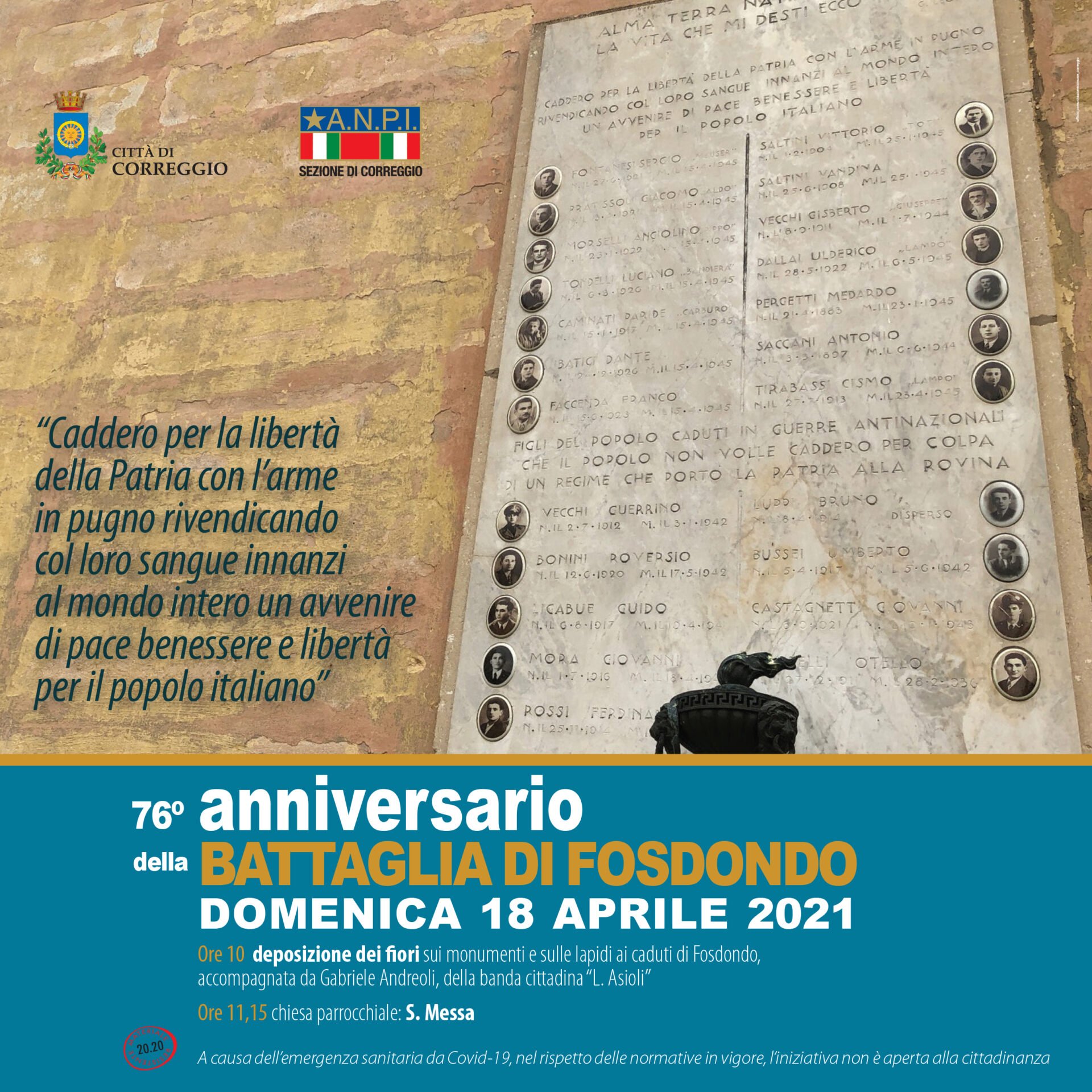Alle ore 10 deposizione dei fiori, da parte del sindaco di Correggio, Ilenia Malavasi, sui cippi ai caduti, con accompagnamento di Gabriele Andreoli, della banda cittadina “L. Asioli”.