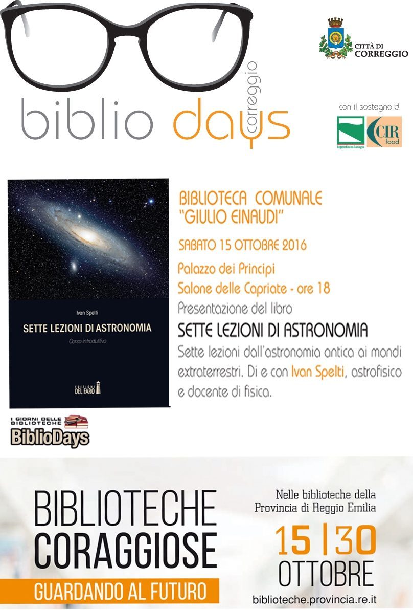 Alle ore 18, sempre a Palazzo dei Principi, ma nel salone delle Capriate, presentazione del libro “Sette lezioni di astronomia”, dal mondo antico agli extraterrestri, di e con Ivan Spelti, astrofisico e docente di fisica.