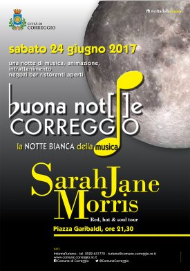 Evento centrale sul palco di piazza Garibaldi, dove arriva un’artista eccezionale, Sarah Jane Morris, che farà tappa a Correggio con il suo “Red, hot & soul tour”.