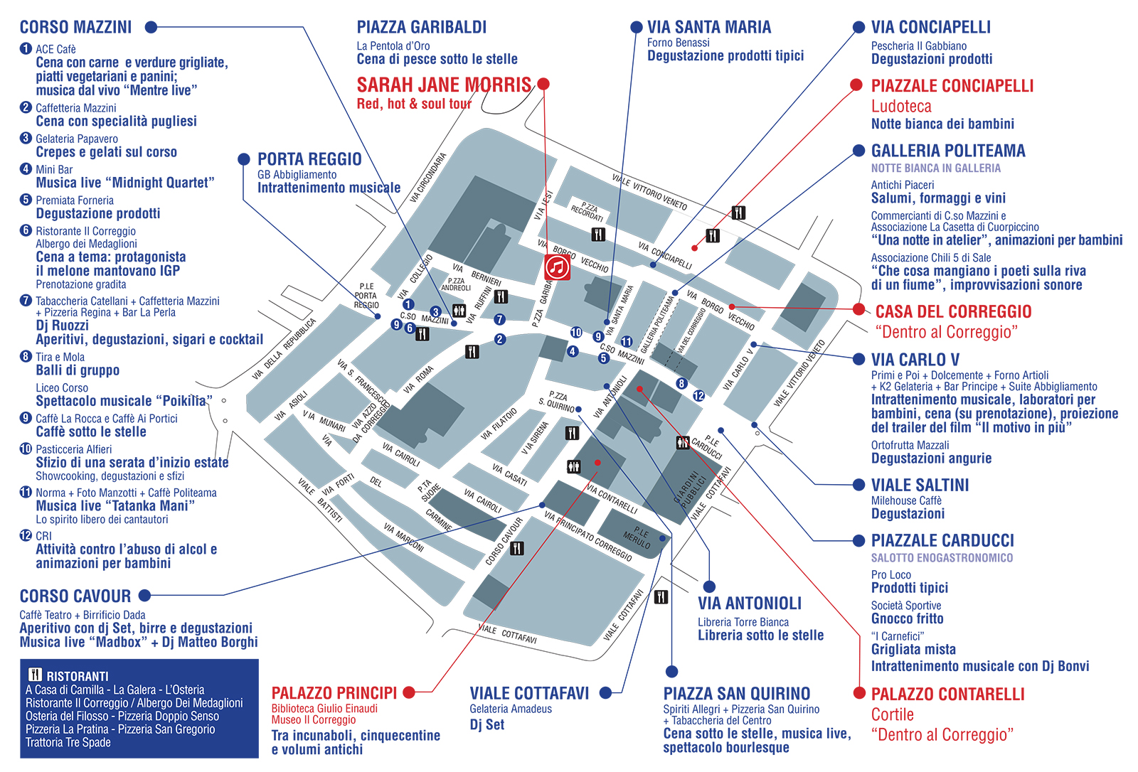 Dopo lo straordinario successo del concerto di Fiorella Mannoia, la musica e l’arte saranno ancora una volta protagonisti a Correggio, sabato 24 giugno, con “Buonanotte Correggio – La notte bianca della musica”, che rinnoverà il successo delle passate edizioni animando il centro di Correggio con concerti, gastronomia e spettacoli fino a tarda notte.