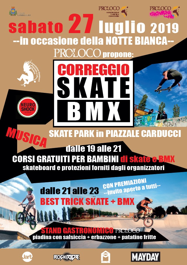 Tra gli altri appuntamenti, si segnalano il concerto dei Tatanka Mani – in corso Mazzini, all’altezza Municipio – e la “Correggio Skate BMX”, promossa da Pro Loco in piazzale Carducci: dalle ore 19, corsi gratuiti per bambini di skate e BMX, con materiali e protezioni forniti dagli organizzatori, e a seguire esibizione “Best trick skate + BMX”.