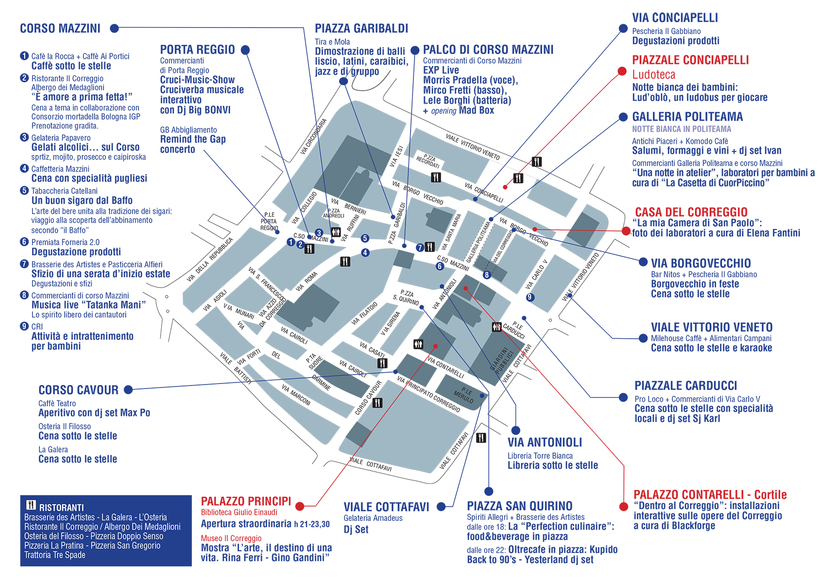 “Nell’ambito di una programmazione estiva molto intensa, la notte bianca rappresenta un appuntamento che, negli anni, è diventato un momento molto atteso da tutta la città”, commenta il sindaco, Ilenia Malavasi. “Quest’anno, in particolare, la collaborazione con gli esercenti e i commercianti testimonierà ancora una volta le caratteristiche che sono proprie di Correggio: la musica, la cultura, l’arte e la buona cucina. La notte bianca chiude un mese, quello di giugno, che dalla fiera di San Quirino al concerto di Antonello Venditti, passando per le serate della movidaCavour e il cinema estivo, ha accompagnato questo inizio d’estate attraverso numerosi eventi, per uno sforzo complessivo che l’amministrazione comunale ha messo in campo con l’obiettivo di vivacizzare e rendere sempre più vivibile la nostra città. E, come nelle migliori tradizioni, possiamo dire che ‘non finisce qui’, considerato che anche i mesi di luglio e di agosto saranno protagonisti di altri appuntamenti rivolti a tutte le fasce d’età”.