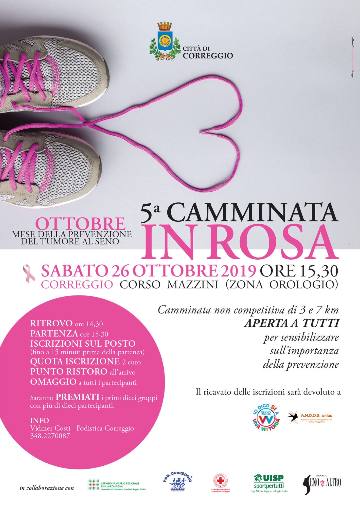 Sabato 26 ottobre il Comune di Correggio, in collaborazione con AUSL Reggio Emilia, Podistica Correggio, Croce Rossa Correggio e UISP, promuove la quinta edizione della “Camminata in rosa”, percorsi non competitivi di 3 e 7 km, aperti a tutti, per sensibilizzare sull’importanza della prevenzione nella lotta al tumore al seno. La camminata, infatti, conclude il mese della prevenzione contro il cancro al seno, con iniziative che a livello nazionale sono caratterizzate dal “nastro rosa”.