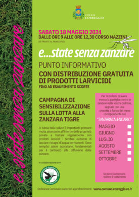 Per questo, sabato 18 maggio dalle ore 9 alle ore 12.30 in Corso Mazzini verranno distribuiti gratuitamente i prodotti larvicidi e ci sarà un punto informativo per richieste specifiche.