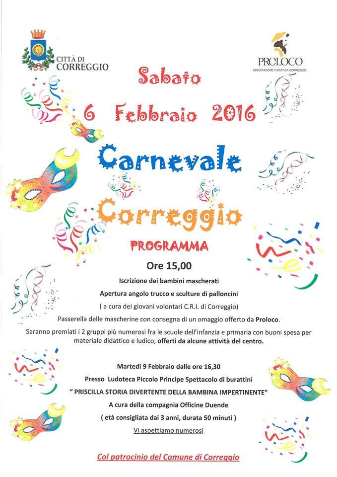 Un sabato pomeriggio di festa, tra mascherine, travestimenti, trucchi e palloncini per il carnevale organizzato a Correggio da Proloco, col patrocinio del Comune.