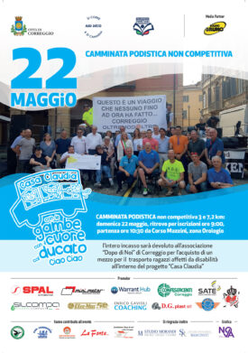 Al via le pre-iscrizioni per “Casa Claudia. Con le gambe, con il cuore, col ducato ciao ciao”, la camminata non competitiva di 3 e 7,2 chilometri, promossa da Comune di Correggio, A.S.D Déco Si Corre & Si Cammina e Virtus Correggio, che si terrà domenica 22 maggio e raccoglierà fondi a favore della Fondazione Dopo di Noi per l’acquisto di un pullmino per i ragazzi che abiteranno e frequenteranno “Casa Claudia”. Il banchetto per le iscrizioni sarà allestito sabato 23 aprile, in corso Mazzini (all’altezza della Galleria Politeama), dalle ore 9 alle ore 13. Il costo base per l’iscrizione è di 5 euro, comprendenti anche la maglietta da indossare il giorno della manifestazione.