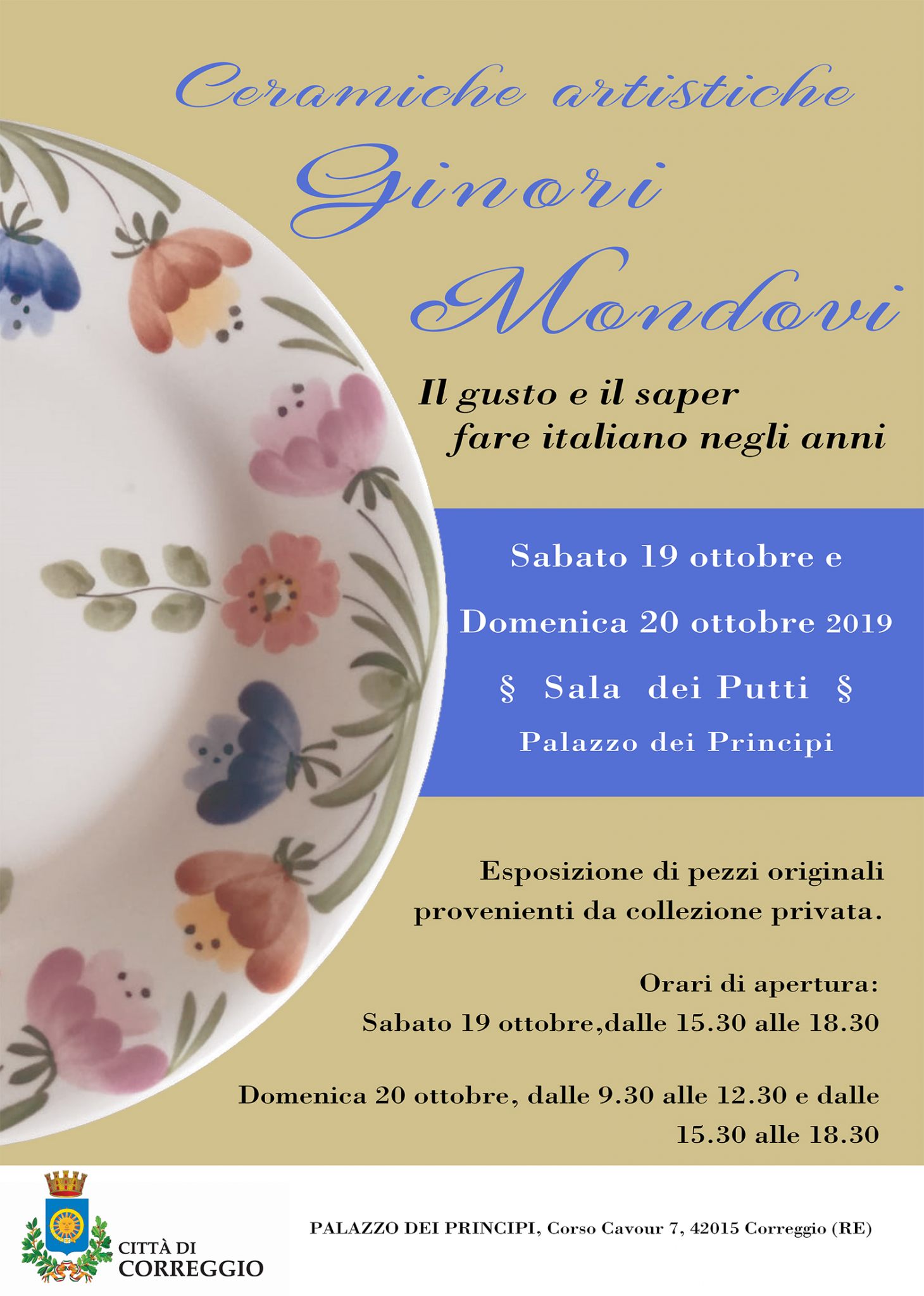 Sabato 19 e domenica 20 ottobre, in occasione di “Correggio in autunno”, la tradizionale Fiera di San Luca a Correggio, la Sala dei Putti di Palazzo dei Principi ospita “Ceramiche artistiche Ginori Mondovì – Il gusto e il saper fare italiano negli anni”, esposizione di ceramiche, pezzi originali provenienti da una collezione privata.