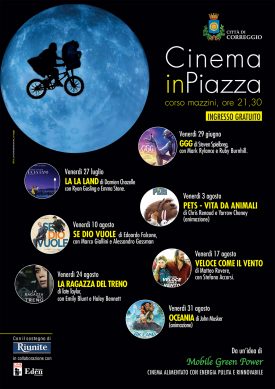 L’iniziativa, nata da un’idea di Mobile Green Power e promossa dal Comune di Correggio in collaborazione con Cinecomio e Cinema Eden di Puianello, con il sostegno di Cantine Riunite, vedrà dunque sette proiezioni – tutte alle ore 21,30 – sul grande schermo installato in corso Mazzini, a ingresso gratuito: si comincia venerdì 29 giugno, con “GGG”, dove Steven Spielberg dirige il film tratto dal capolavoro di Roald Dahl. A seguire, venerdì 27 luglio, “La La Land”, musical da Premio Oscar, con Ryan Gosling e Emma Stone; venerdì 3 agosto, “Pets – Vita da animali”, film d’animazione dai creatori della saga di “Cattivissimo Me”; venerdì 10 agosto, “Se Dio vuole”, divertente e toccante film di Edoardo Falcone, con Marco Giallini e Alessandro Gassman; venerdì 17 agosto, “Veloce come il vento”, con uno straordinario Stefano Accorsi diretto da Matteo Rovere; venerdì 24 agosto, “La ragazza del treno”, thriller campione d’incassi dal romanzo di Paula Hawkins, con Emily Blunt e Haley Bennett; venerdì 31 agosto, infine, “Oceania”, film d’animazione Disney, dagli autori di “Frozen”.