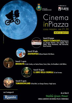 L’iniziativa, nata da un’idea di Mobile Green Power e promossa dal Comune di Correggio in collaborazione con Cinecomio e Cinema Eden di Puianello, con il sostegno di Cantine Riunite, vede la proiezione – sempre alle ore 21,30 – di cinque film sul grande schermo installato in corso Mazzini, a ingresso gratuito: si comincia venerdì 30 giugno, con “Perfetti sconosciuti”, film rivelazione di Paolo Genovese, con Marco Giallini, Valerio Mastrandrea e Kasia Smutniak. A seguire, venerdì 28 luglio, “Zootropolis”, una produzione Walt Disney dai creatori di “Frozen”; venerdì 11 agosto, “Brooklyn”, il film di John Crowley candidato a tre Premi Oscar; venerdì 18 agosto, “Il libro della giungla”, magnifica trasposizione in film del capolavoro Disney; venerdì 25 agosto, infine, “Tomorrowland”, con George Clooney diretto da Brad Bird.