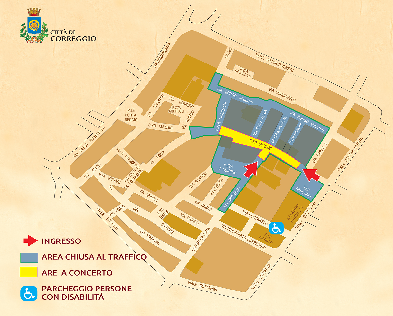 Dalle ore 14 di sabato 17 giugno alle ore 7 di domenica 18 giugno: divieto di sosta con rimozione forzata e divieto di transito in piazzale Carducci, corso Mazzini (nel tratto compreso tra via Carlo V e vi Ruffini), via Bernieri (tra piazza Garibaldi e piazza Don Andreoli), piazza Garibaldi, via Santa Maria, via Borgovecchio (da via Carlo V a piazza Garibaldi) e via Del Correggio.
