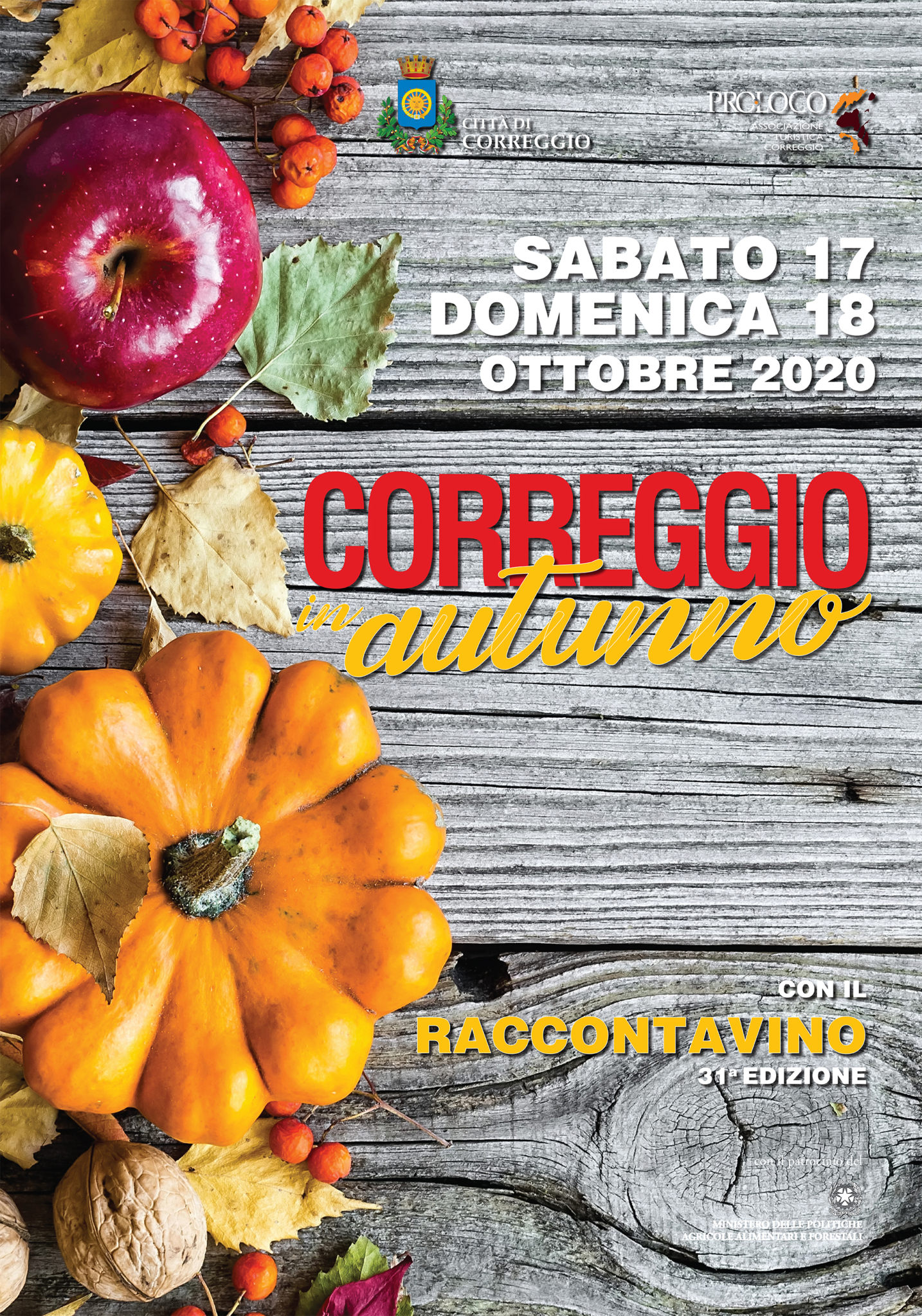 Domenica 18 ottobre, alle ore 10,30, nel cortile di Palazzo dei Principi, 31esima edizione per il “Raccontavino”, tradizionale gara enologica, con assaggi e premiazioni dei partecipanti e dei vincitori. Alla Torre civica, alle ore 12, donazione alla città del plastico di Correggio, già ospitato nella stessa Torre e realizzato da Tienno Tagliavini, da parte del Lion Club Correggio “Antonio Allegri”. Nel pomeriggio, dalle finestre del Municipio, alle ore 15,30 (con replica alle ore 16,30), le Coriste per Caso in “Voci alla Finestra”, canti di voci femminili.
