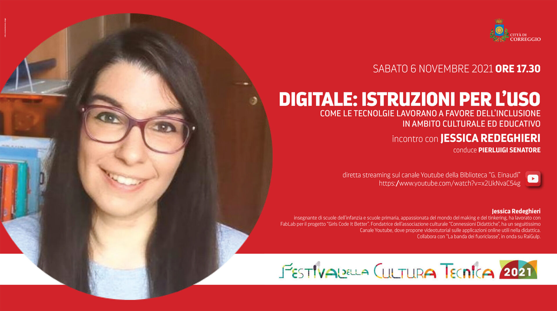 “Digitale, istruzioni per l’uso: come le tecnologie lavorano a favore dell’inclusione in ambito culturale ed educativo“. Questo il tema dell’intervento – sabato 6 novembre, ore 17,30 – di Jessica Redeghieri, in diretta streaming sul canale YouTube della biblioteca comunale “Giulio Einaudi”.Jessica Redeghieri, insegnante di scuole dell’infanzia e scuole primaria, appassionata del mondo del making e del tinkering, ha lavorato con FabLab per il progetto “Girls Code It Better”. Fondatrice dell’associazione culturale “Connessioni Didattiche”, ha un seguitissimo Canale Youtube, dove propone videotutorial sulle applicazioni online utili nella didattica. Collabora con “La banda dei fuoriclasse”, in onda su RaiGulp.