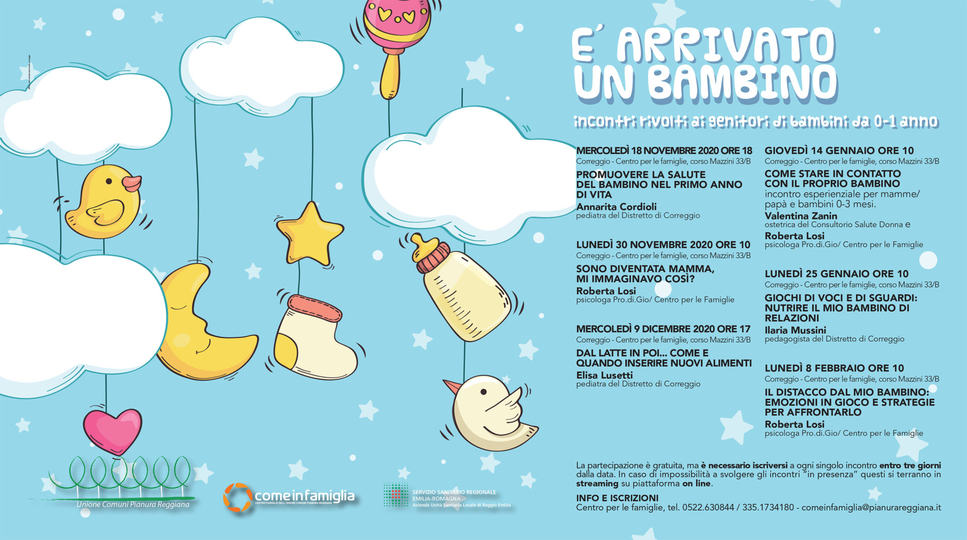È arrivato un bambino” è il calendario di sei incontri, promosso da Comeinfamiglia, il centro per le famiglie dell’Unione Comuni Pianura Reggiana. Gli incontri si svolgono in streaming, su piattaforma online.