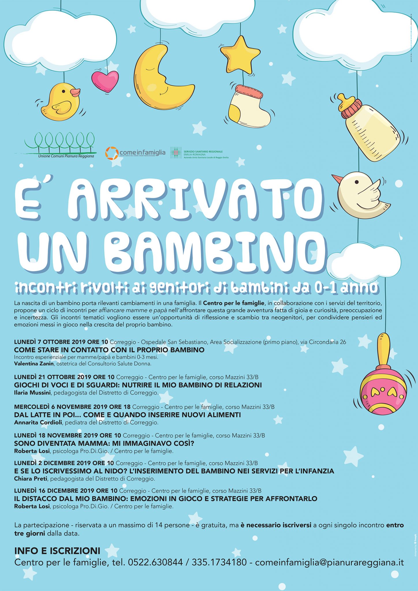 Sono aperte le iscrizioni a “È arrivato un bambino”, il calendario di sei incontri, promosso da Comeinfamiglia, il centro per le famiglie dell’Unione Comuni Pianura Reggiana. Gli incontri si svolgeranno tutti alle ore 10, ad eccezione di quello del 6 novembre, in programma alle ore 18. La sede sarà sempre quella del centro per le famiglie del Distretto di Correggio, a Correggio, in corso Mazzini 33/B, ad eccezione del primo appuntamento, di lunedì 7 ottobre, nell’Area socializzazione, al primo piano dell’Ospedale San Sebastiano di Correggio.
