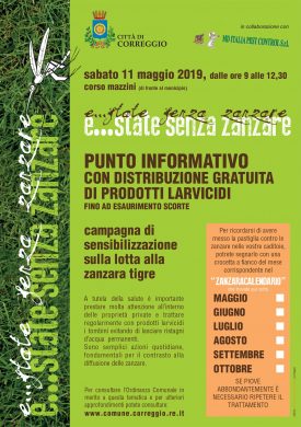 Per un’estate senza zanzare: sabato 11 maggio, dalle ore 9, punto informativo in corso Mazzini a Correggio con distribuzione gratuita di prodotti larvicidi.