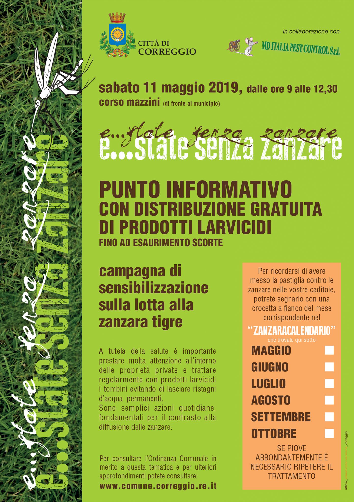 “E… state senza zanzare” è il titolo della campagna di sensibilizzazione sulla lotta alla zanzara tigre promossa dal Comune di Correggio, in collaborazione con MD Italia Pest Control.