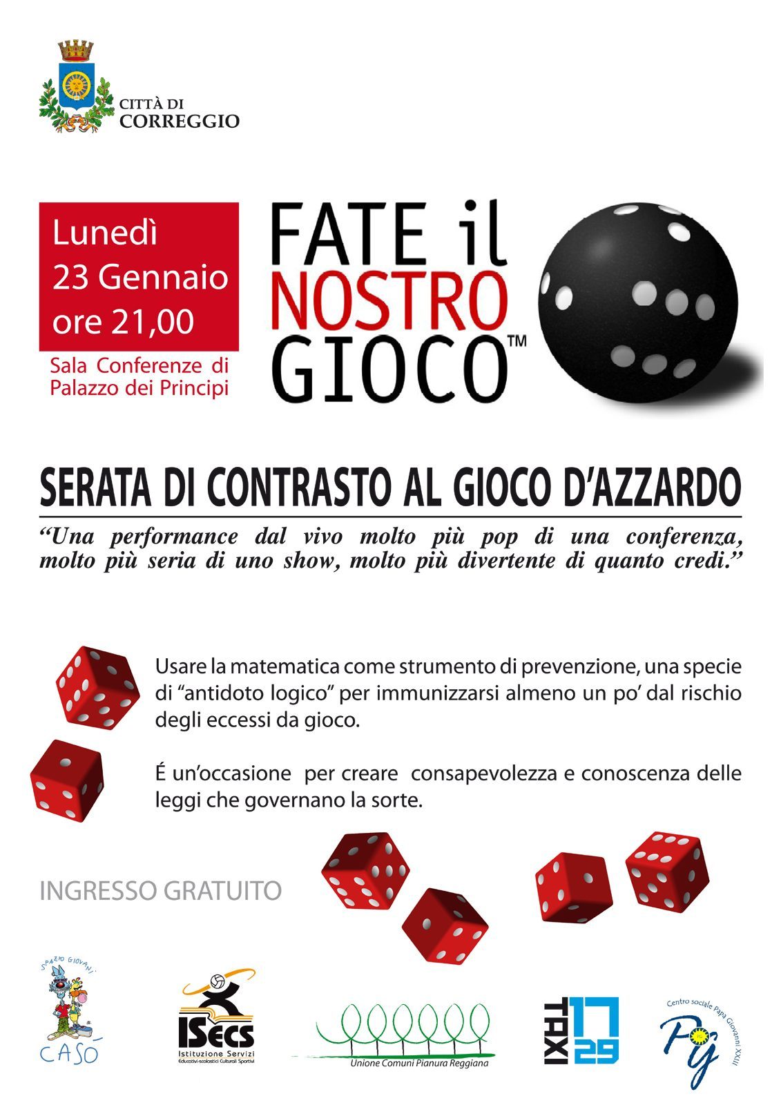 Serata di informazione contro il gioco d’azzardo, lunedì 23 gennaio, a Correggio, alle ore 21, nella sala conferenze “A. Recordati” di Palazzo dei Principi, con “Fate il nostro gioco” performance live curata dall’associazione TAX1729, fondata su un ampio studio della matematica del gioco d’azzardo e condotta da Paolo Canova e Diego Rizzuto, un matematico e un fisico.