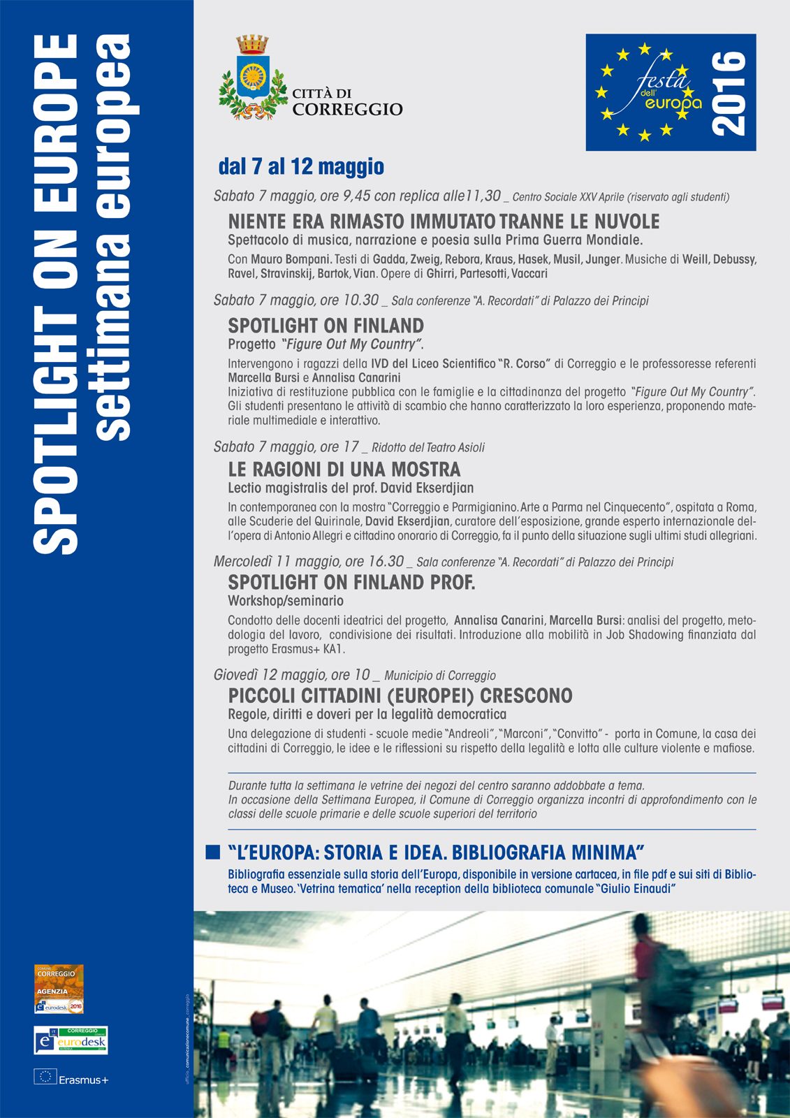 Il 9 maggio – giorno della storica dichiarazione di Parigi, nel 1950, che diede ufficialità alla costituzione di un’alleanza di paesi europei riguardo temi commerciali e salvaguardia della pace – ricorre la Festa dell’Europa. Per l’occasione, il Comune di Correggio promuove una serie di appuntamenti – dal 7 al 12 maggio – coinvolgendo scuole e cittadinanza: “Spotlight… on Europe” è il titolo dell’iniziativa, che segue gli incontri sul tema europeo già svolti durante il mese di marzo nelle classi quinte delle scuole primarie di Correggio e curate dell’Ufficio politiche europee del Comune di Correggio, che è punto di riferimento provinciale “Eurodesk”.
