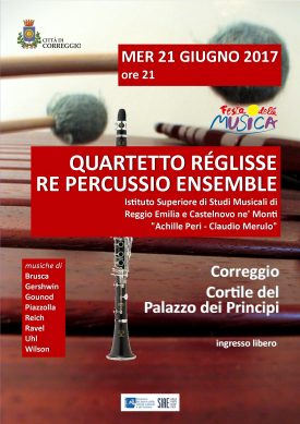 Sul palco del Cortile di Palazzo dei Principi – corso Cavour 7, ore 21, ingresso libero – il concerto promosso dal Comune di Correggio, con il Quartetto Réglisse e il RePercussio Ensemble, gruppi nati dal prezioso lavoro di studenti, ex-studenti ed insegnanti dell’Istituto Peri-Merulo di Reggio Emilia-Castelnovo Monti.