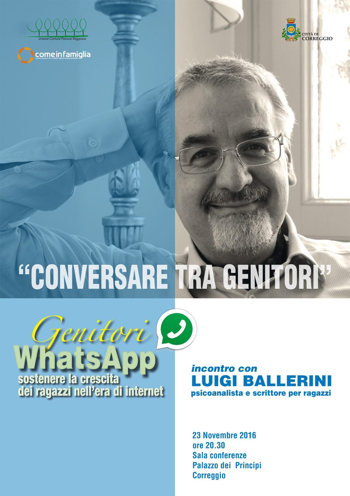 luigi-balleriniSi intitola “Genitori Whatsapp – Sostenere la crescita dei ragazzi nell’era di Internet” l’incontro con lo psicoanalista e scrittore Luigi Ballerini promosso da “Come in famiglia”, il centro famiglie del Distretto di Correggio, mercoledì 23 novembre, alle ore 20,30 nella sala conferenze “A. Recordati” di Palazzo dei Principi.