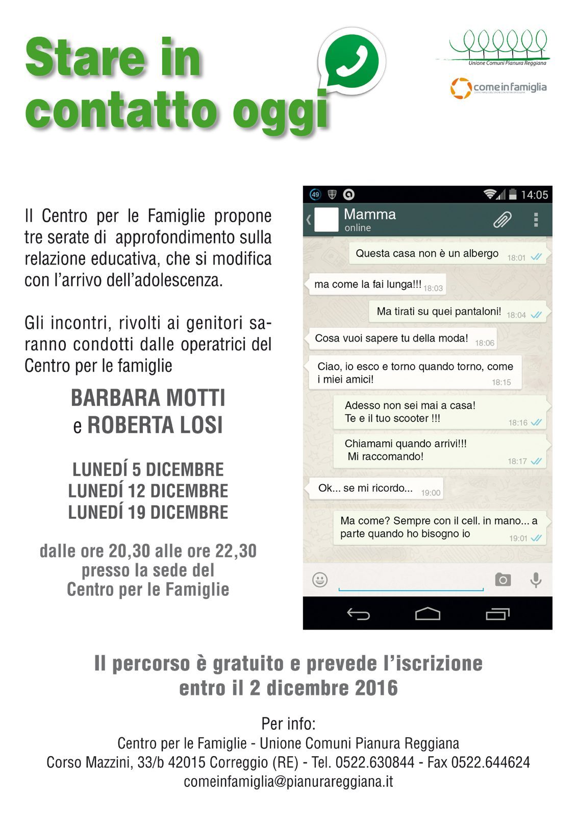 L’appuntamento con Luigi Ballerini – che incontrerà poi i ragazzi delle scuole medie e superiori, giovedì 24 novembre, al Centro Sociale 25 Aprile – precede stare-in-contatto-oggiStare in contatto oggi”, tre serate di approfondimento sulla relazione educativa e l’adolescenza, sempre promosse da “Come in famiglia” e condotte dalle operatrici del Centro, Barbara Motti e Roberta Losi. Gli incontri – lunedì 5, 12 e 19 dicembre, dalle ore 20,30 alle ore 22,30, nella sede del Centro, in corso Mazzini 33/B a Correggio – sono rivolti a genitori di figli adolescenti (12/16 anni).