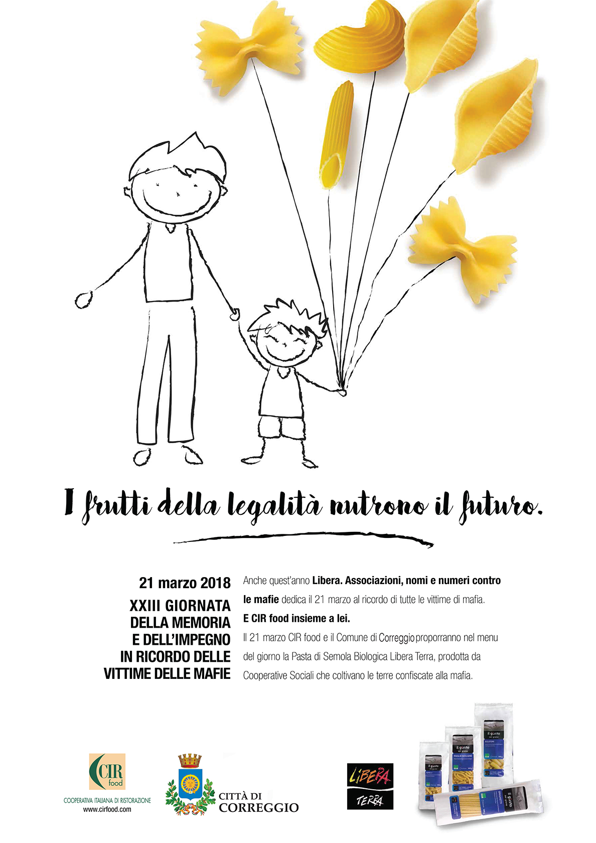 Mercoledì 21 marzo, “Giornata della memoria e dell’impegno in ricordo delle vittime innocenti delle mafie”, il Comune di Correggio e CIR Food varieranno il menu dei pasti distribuiti in tutte le scuole correggesi, comprese quelle interessate dalle attività dei Centri giochi territoriali, utilizzando la pasta biologica prodotta da Libera, che coltiva terreni e beni confiscati alla criminalità organizzata.