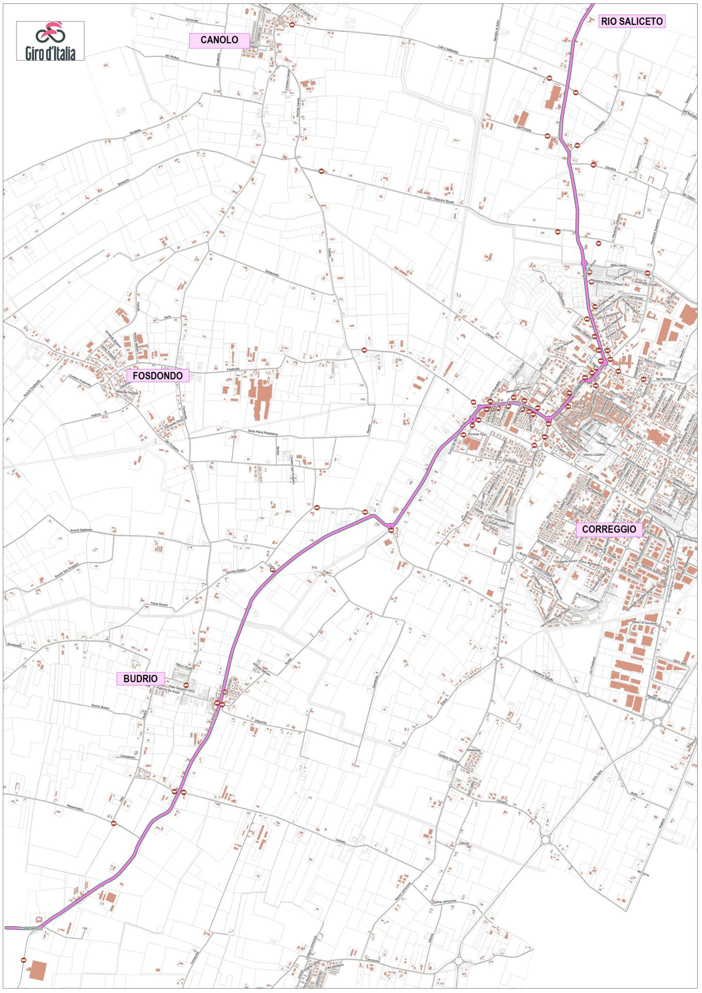 Per le stesse ragioni e nello stesso arco temporale, saranno chiuse tutte le intersezioni con le strade interessate dal passaggio dei ciclisti: via Lupi e Sabbietta, via Sant’Orsola, via Naviglietto, via Gandina, via don Pasquino Borghi, via Mandriolo Inferiore, via Della Libertà, via Mons. Tesauri, via Zanichelli, via Lazzaretto, piazzale 2 Agosto, piazzale San Rocco, via Prati, via Leopardi, via Carletti, via Battisti, via Mussini, via Nievo, via Alighieri, via Ariosto, via Manzoni, via Petrarca, via Boccaccio, via Goldoni, via Pirandello, via Dei Mille (tra l’intersezione con via Fazzano e l’intersezione con via Per Reggio), piazzale Finzi, via San Prospero, via Ruota, via Corta, via Ascari, via Budrio, via Imbreto, via Massenzatico.