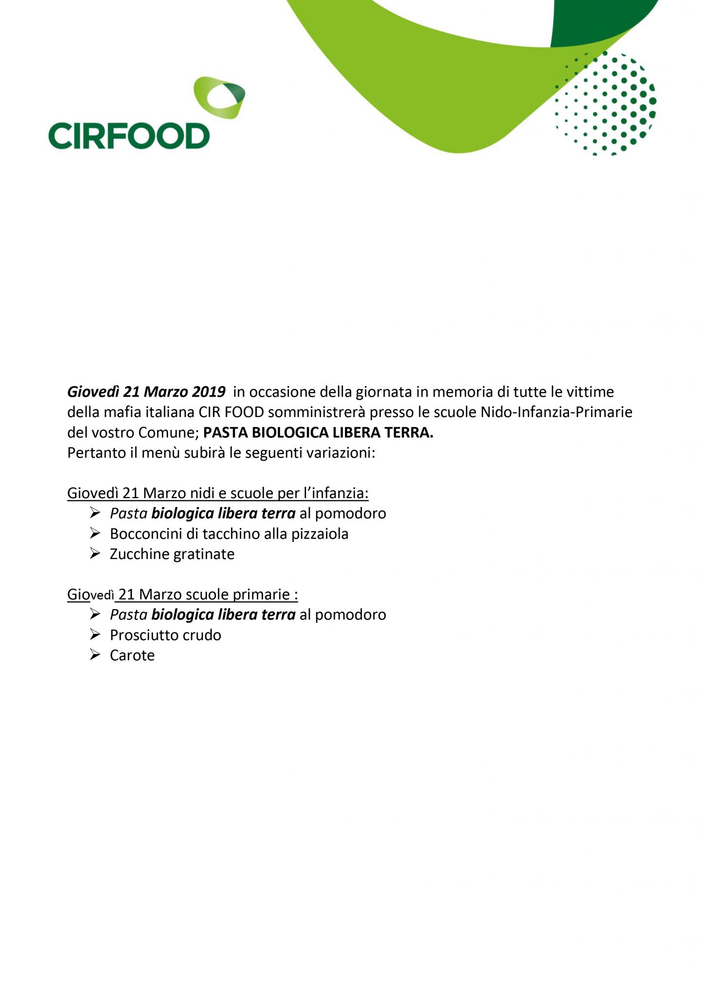 Giovedì 21 marzo – “Giornata della memoria e dell’impegno in ricordo delle vittime innocenti delle mafie” – il Comune di Correggio e CIR Food variano il menu dei pasti distribuiti in tutte le scuole correggesi, utilizzando la pasta biologica prodotta da Libera, che coltiva terreni e beni confiscati alla criminalità organizzata.