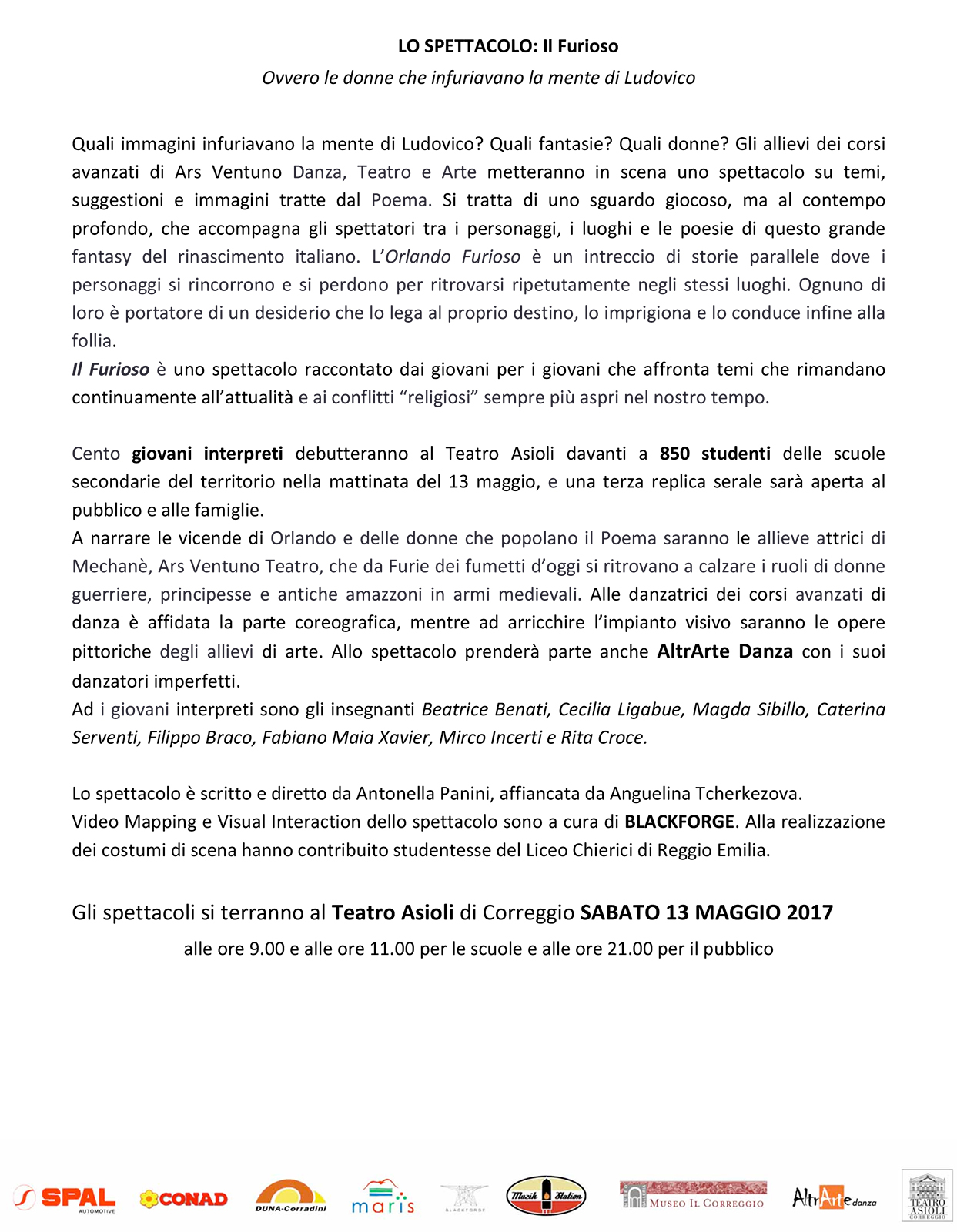 Una mostra, uno spettacolo e oltre 100 allievi di arte, danza e teatro: tutto questo è “Il Furioso”, il progetto culturale promosso da ARS Ventuno con il patrocinio della Regione Emilia-Romagna e del Comune di Correggio, nel cinquecentesimo anniversario dalla pubblicazione de “L’Orlando Furioso” di Ludovico Ariosto.
