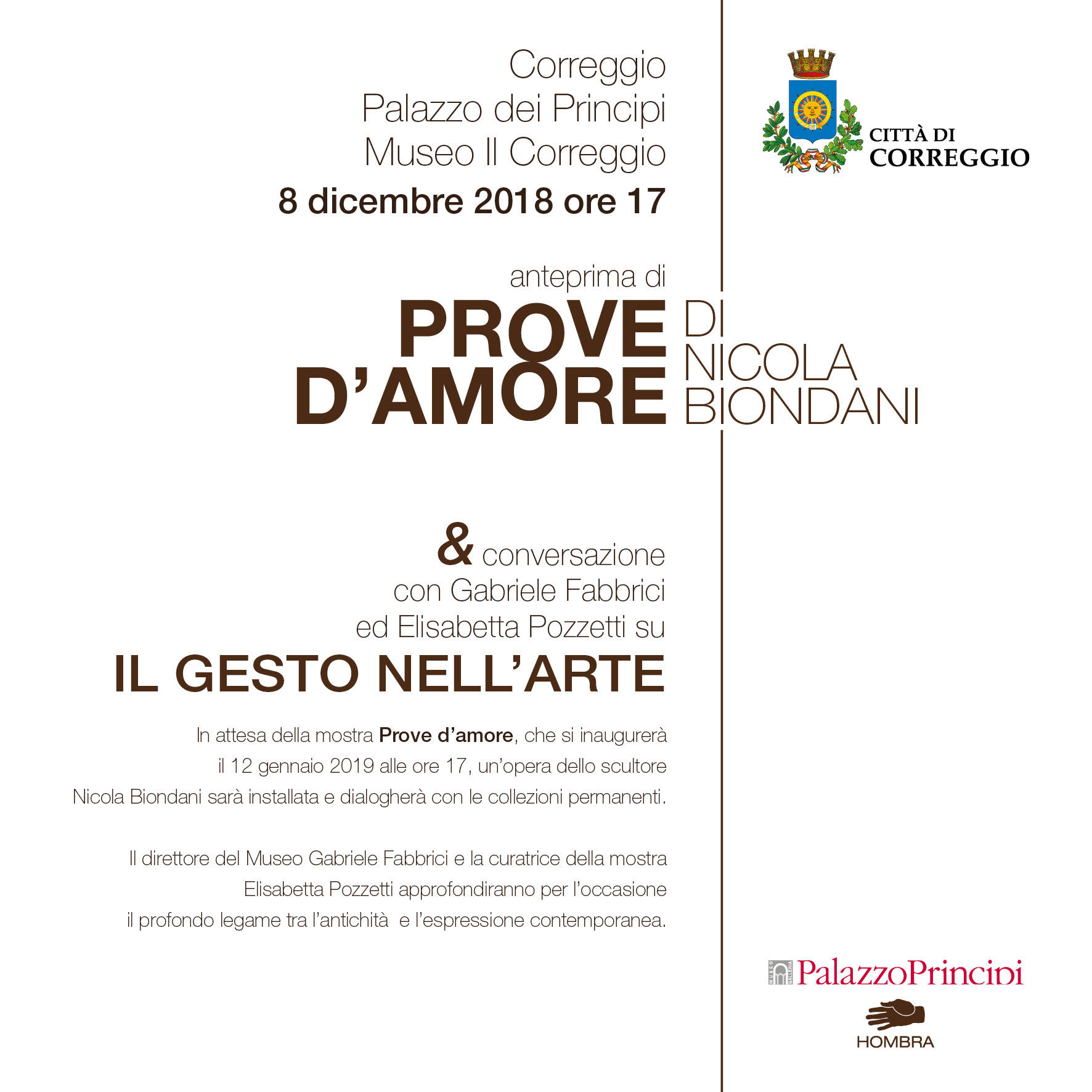 “Prove d’amore” focalizza la ricerca e l’attenzione dello scultore Nicola Biondani sul sacrificio che si è disposti a fare per amore. In particolare su quelle prove a cui i Santi si sono prestati, sopportando il dolore finanche il martirio. L’amore può dunque essere anche un territorio di sofferenza e resistenza a oltranza. Fin dove siamo disposti a sopportare? Dov’è la soglia oltre la quale non avremo la forza e il coraggio di andare? L’amore sacrale richiede una totale dedizione ma pure l’amore profano conosce lo stesso alfabeto di rispetto, fedeltà e abnegazione. Le sculture, realizzate appositamente per la mostra e presentate in esclusiva dal 12 gennaio 2019 nelle sale del Museo “Il Correggio” di Palazzo Principi, instaureranno una relazione feconda con le opere antiche. Perché se è diversa la tecnica – alcune delle opere saranno in cemento – in comune vi è la stessa nobile ritualità dei gesti, delle mani, della mano di Dio che benedice, salva o condanna. Attraverso la sensibilità contemporanea, sarà sollecitata una rilettura contestuale dei dipinti e delle sculture presenti nella collezione permanente del Museo.