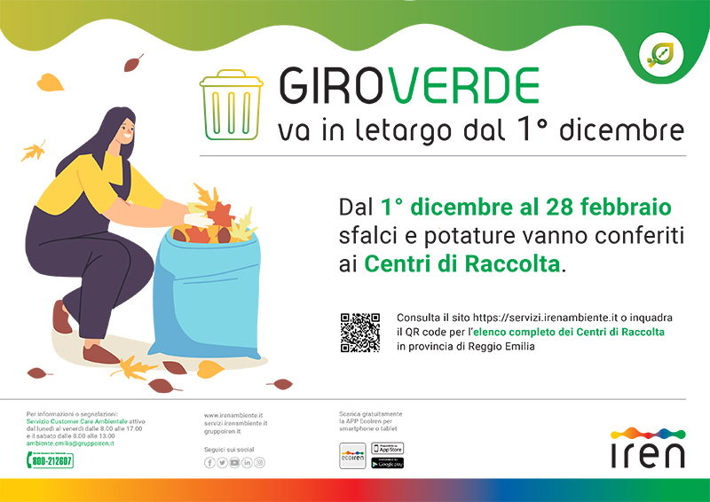 Dal 1° dicembre sino al prossimo 1 marzo 2023 scatta la consueta sospensione invernale del “Giroverde”, in concomitanza con il fermo stagionale della attività vegetativa delle piante e dei tappeti erbosi. A Correggio sarà comunque possibile conferire sfalci d’erba e potature recandosi presso il centri di raccolta in via Pio La Torre.