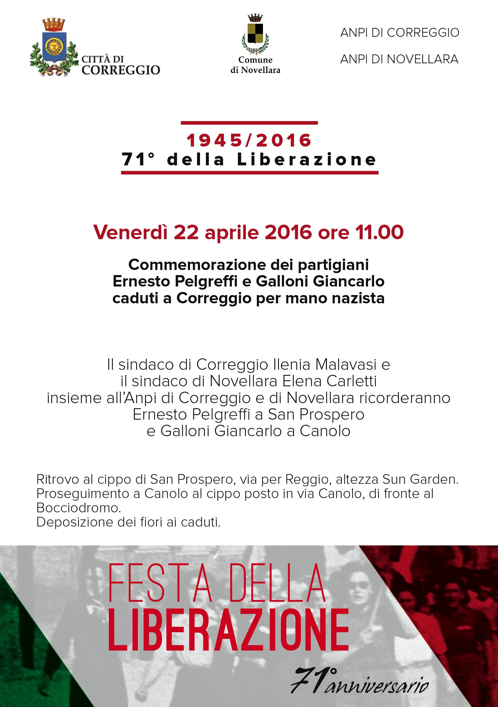 In precedenza, al mattino, la Santa Messa, alle ore 10 in San Francesco, e a seguire il corteo accompagnato dalla banda cittadina “Luigi Asioli”, con la deposizione dei fiori sulle lapidi e sui monumenti ai caduti del centro storico. Alle ore 11,45, interventi di Ilenia Malavasi, sindaco di Correggio, Giacomo Notari, partigiano ed ex presidente ANPI Reggio Emilia, e Giuseppe Lini, presidente ANPI Correggio.