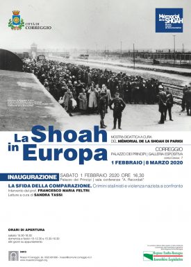 Inaugura sabato 1 febbraio “La Shoah in Europa”, mostra documentaria realizzata dal Mémorial de la Shoah di Parigi, distribuita nella versione italiana da ProForma Memoria grazie al contributo dell’Assemblea Legislativa della Regione Emilia-Romagna e allestita a Correggio, nella Galleria Espositiva del Museo Il Correggio, a Palazzo dei Principi. Ospite all’inaugurazione sarà il prof. Francesco Maria Feltri, con la lezione – alle ore 16,30, nella sala conferenze “A. Recordati” di Palazzo dei Principi – dal titolo “La sfida della comparazione. Crimini stalinisti e violenza nazista a confronto”.