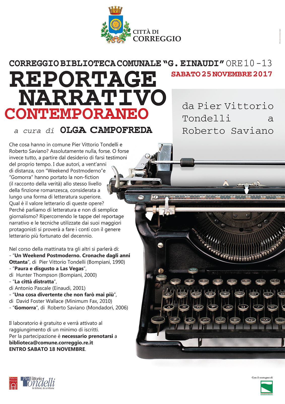 Questo il punto di partenza del laboratorio di reportage narrativo contemporaneo, promosso dalla biblioteca comunale “G. Einaudi” e dal Centro di Documentazione Pier Vittorio Tondelli a Correggio, sabato 25 novembre, dalle ore 10 alle ore 13.