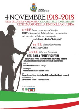 Il Comune di Correggio, in collaborazione le associazioni ANMIG, ANCR e ANPI, promuove, domenica 4 novembre, il programma delle iniziative in occasione della Festa dell’Unità Nazionale, Giornata delle Forze Armate e Centenario della fine della Prima Guerra Mondiale.