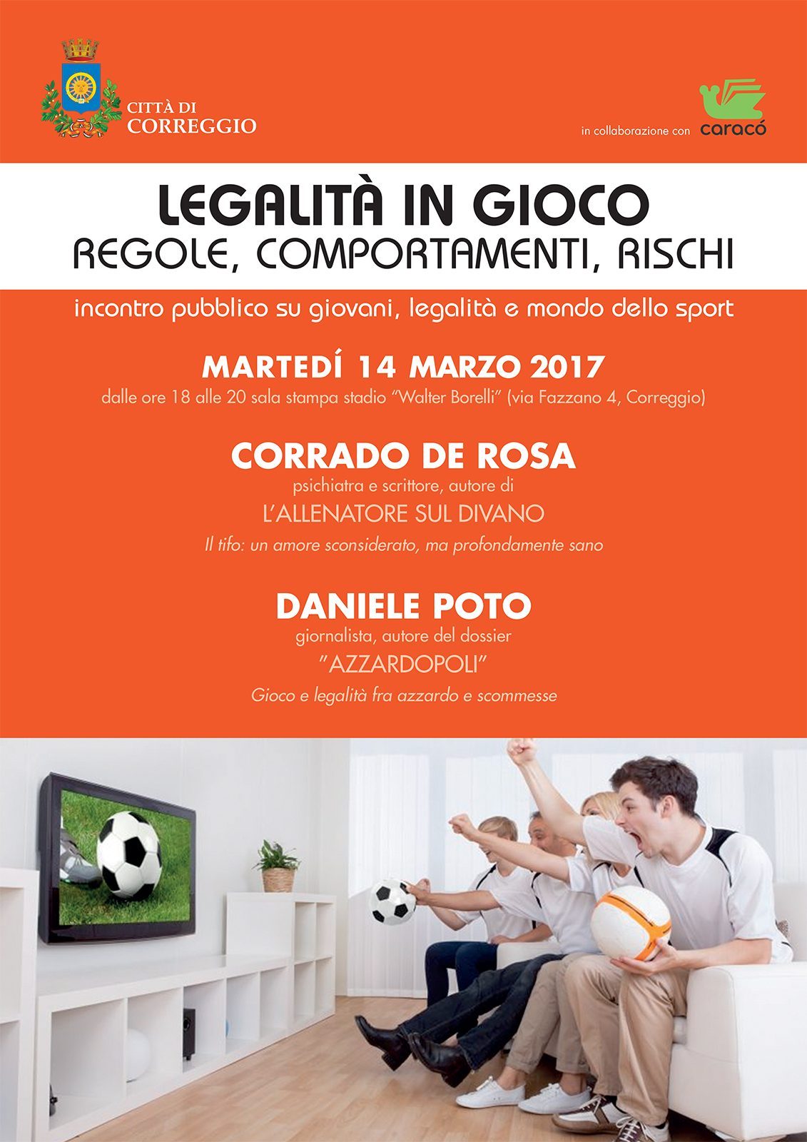 Si intitola “Legalità in gioco: regole, comportamenti, rischi”, l’incontro pubblico su giovani, legalità e mondo dello sport promosso dal Comune di Correggio, in collaborazione con l’associazione Caracò, martedì 14 marzo, alle ore 18, nella sala stampa dello Stadio “W. Borelli” (via Fazzano, 4). Ospiti saranno Corrado De Rosa, psichiatra, scrittore, autore di “L’allenatore sul divano”, e Daniele Poto, giornalista, autore del dossier “Azzardopoli”.