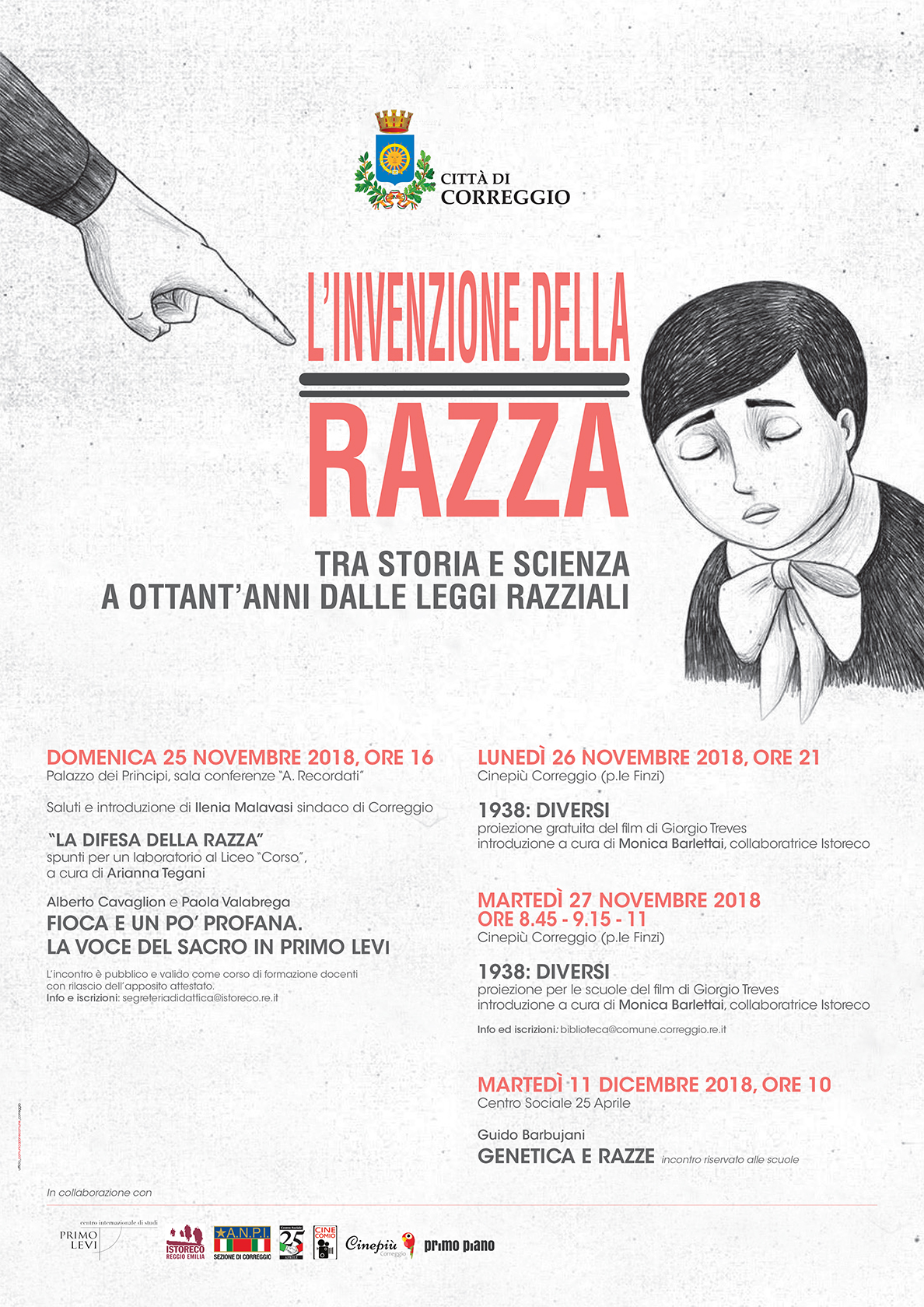 A 80 anni dall’entrata in vigore delle “Leggi razziali” – datate 17 novembre 1938 – “L’invenzione della razza” è il titolo di una serie di iniziative che a Correggio ricorda quel vergognoso passaggio della nostra storia. Due gli appuntamenti pubblici in programma: domenica 25 novembre – ore 16, sala conferenze “A. Recordati” di Palazzo dei Principi – “Fioca e un po’ profana. La voce del sacro in Primo Levi”, incontro con Alberto Cavaglion e Paola Valabrega, promosso in collaborazione con Istoreco e il “Centro internazionale di studi Primo Levi”, in cui i due autori – tra i più noti studiosi dell’opera di Primo Levi – raccontano il tragitto di uno scrittore “illuminista”, come appunto il chimico Primo Levi, lungo i sentieri del sacro, riscontrabile in diverse sue opere. Introduce il sindaco di Correggio, Ilenia Malavasi, mentre la professoressa Arianna Tegani illustra “La difesa della razza”, spunti per un laboratorio condotto con i ragazzi del Liceo Corso.