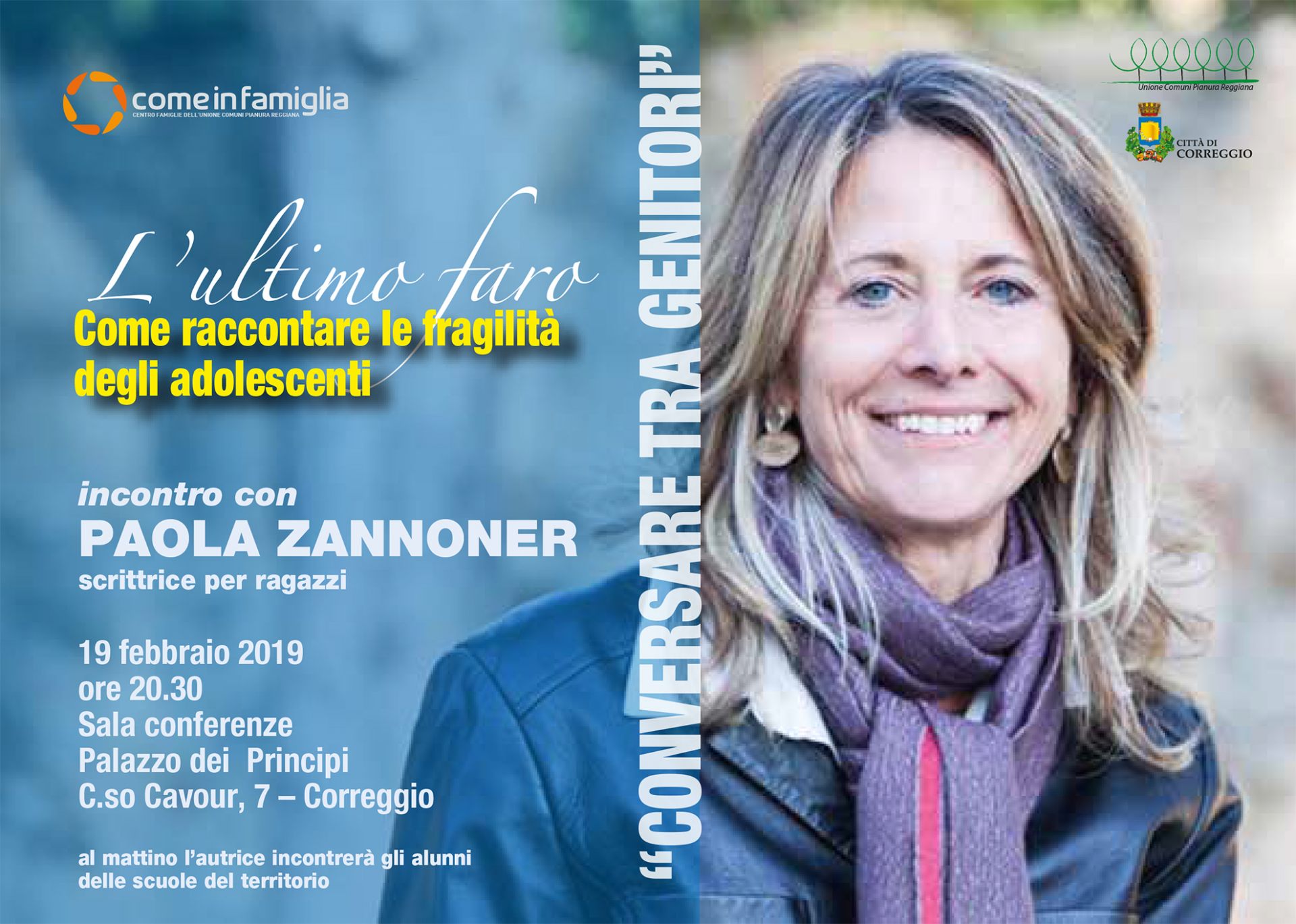 Si intitola “L’ultimo faro. Come raccontare la fragilità degli adolescenti” l’incontro con la scrittrice Paola Zannoner promosso da “Come in famiglia”, il centro famiglie del Distretto di Correggio, martedì 19 febbraio 2019, alle ore 20,30 nella sala conferenze “A. Recordati” di Palazzo dei Principi.