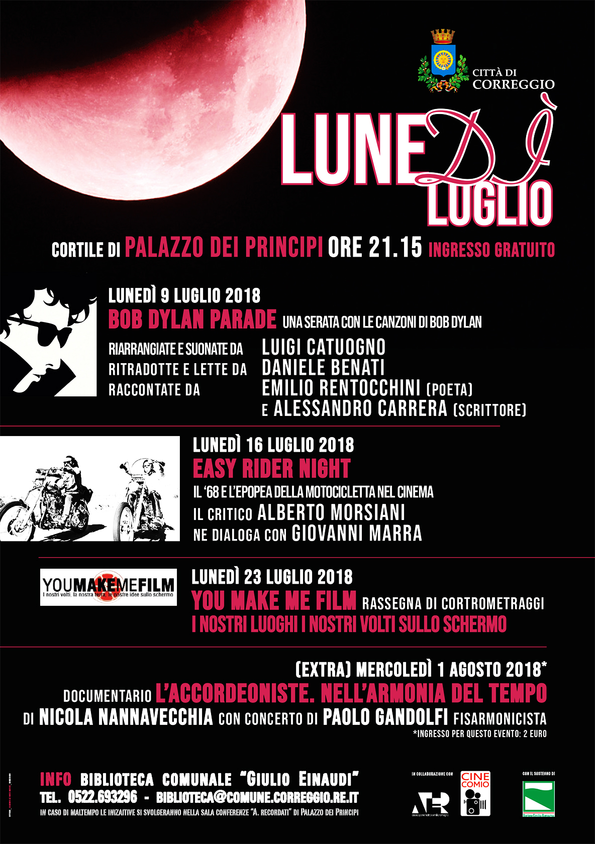 Prima data lunedì 9 luglio con “Bob Dylan Parade”, una serata con le canzoni di Bob Dylan, riarrangiate e suonate alla chitarra classica da Luigi Catuogno, ritradotte e lette da Daniele Benati e raccontate dal poeta Emilio Rentocchini e dallo scrittore Alessandro Carrera. Si prosegue poi lunedì 16 luglio, con una speciale “Easy Rider Night”, immagini, suoni e parole sul ’68 e l’epopea della motocicletta nel cinema, con il critico Alberto Morsiani in dialogo con Giovanni Marra. Lunedì 23 luglio, l’atteso “You make me film”, la fortunata rassegna di cortometraggi che giunge quest’anno alla sedicesima edizione. Infine, mercoledì 1 agosto, anteprima del Festival Mundus con la proiezione de “L’accordeoniste. Nell’armonia del tempo”, documentario di Nicola Nannavecchia, e il concerto del fisarmonicista Paolo Gandolfi.