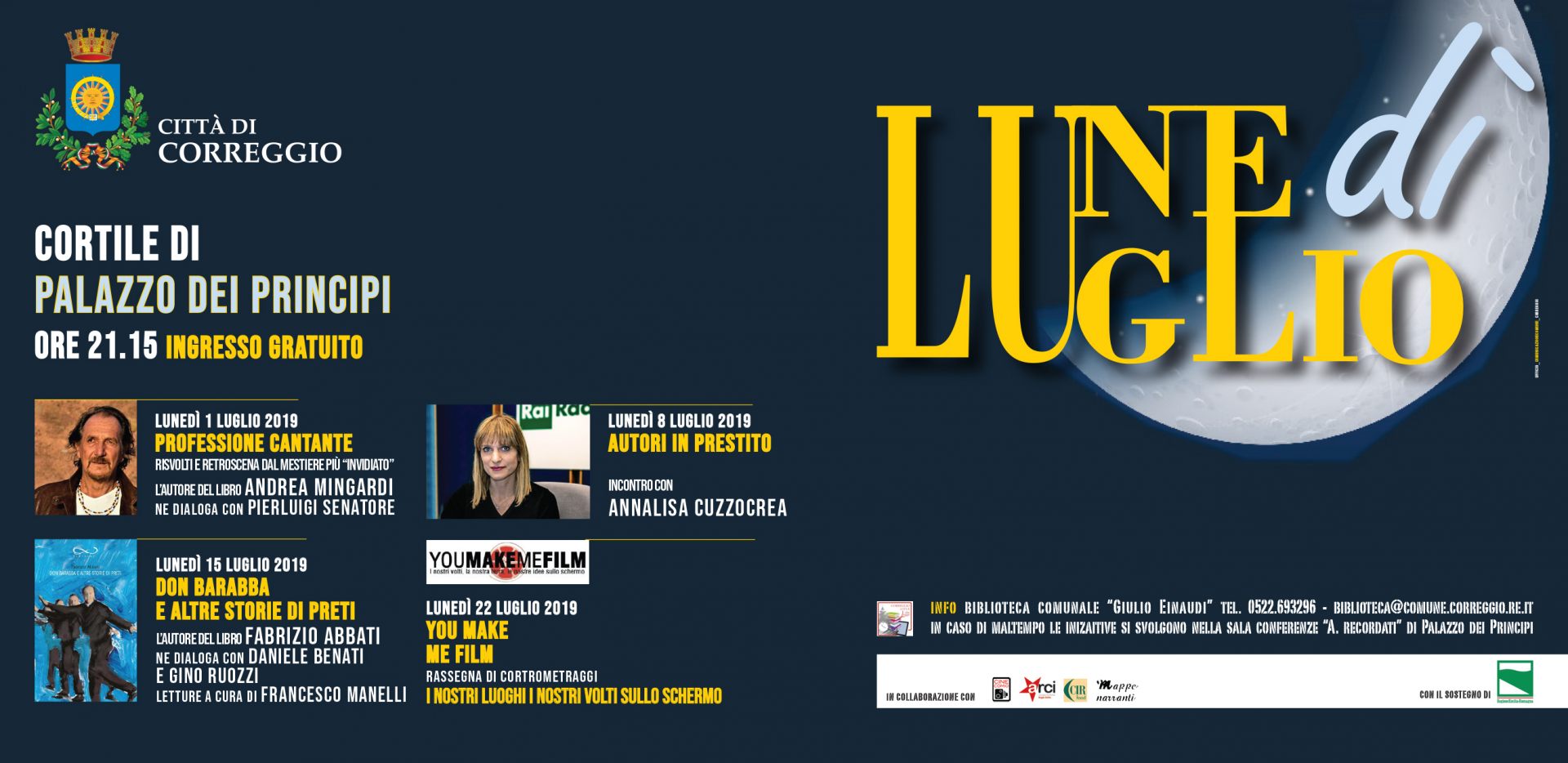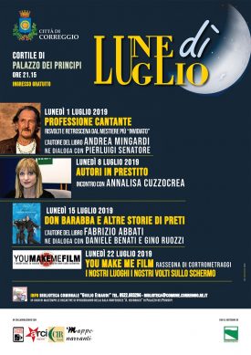 Prima data lunedì 1 luglio con “Professione cantante”, una serata di risvolti e retroscena sul mestiere più “invidiato”, in compagnia di Andrea Mingardi, intervistato da Pierluigi Senatore. Si prosegue poi lunedì 8 luglio, con la rassegna “Autori in prestito”, che porta a Correggio la giornalista e scrittrice Annalisa Cuzzocrea, redattrice politica e inviata di la Repubblica. Lunedì 15 luglio è la volta della presentazione di “Don Barabba e altre storie di preti”, libro di Fabrizio Abbati che ne dialoga con Daniele Benati e Gino Ruozzi, con lettura a cura di Francesco Manelli. Lunedì 22 luglio, infine, l’atteso appuntamento con “You make me film”, la fortunata rassegna di cortometraggi che giunge quest’anno alla diciassettesima edizione.